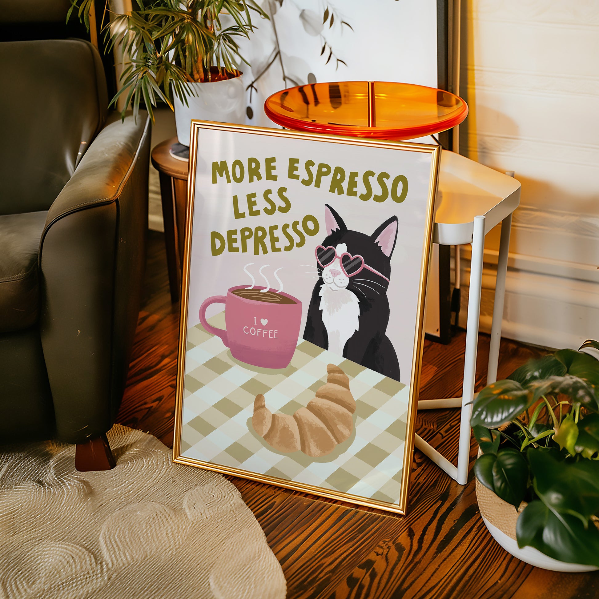 This adorable illustrated cat print is perfect for your kitchen or coffee nook with this. Featuring a tabby, ginger or tuxedo cat wearing heart-shaped sunglasses, sipping espresso, and ready to host your next brunch – this playful piece brings the purr-fect blend of humour and style.