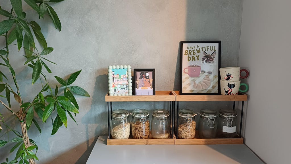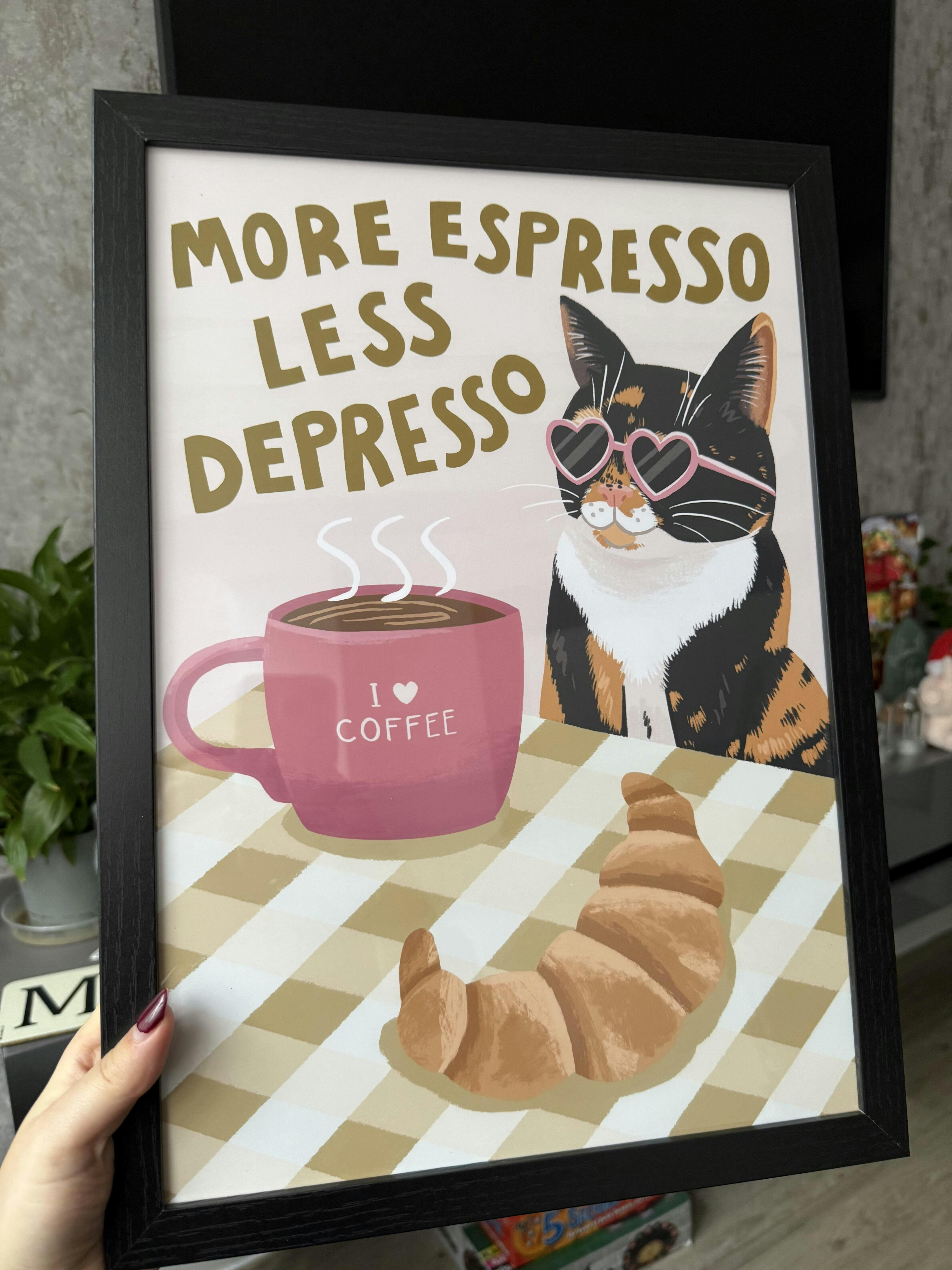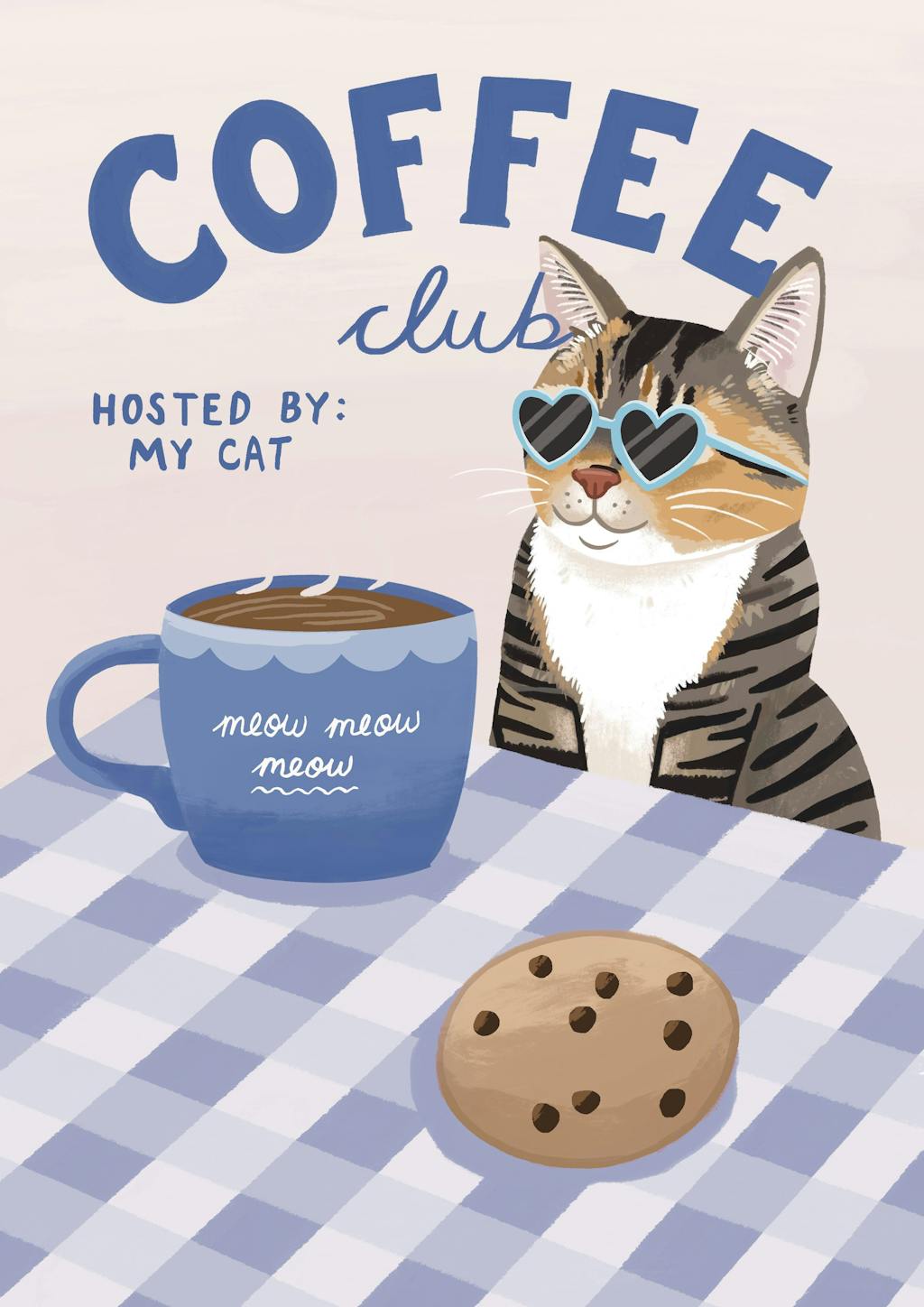 This adorable illustrated cat print is perfect for your kitchen or coffee nook with this. Featuring a tabby, ginger or tuxedo cat wearing heart-shaped sunglasses, sipping espresso, and ready to host your next brunch – this playful piece brings the purr-fect blend of humour and style.