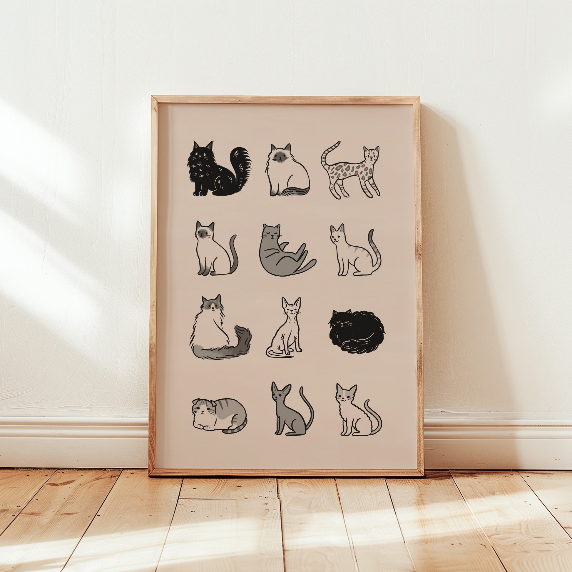 Calling all cat lovers! This illustrated cat breed print is the purr-fect way to celebrate your favourite feline friends. Featuring a line-up of iconic cat breeds from fluffy Persians to sleek Siamese, this minimalist yet characterful artwork adds a cosy, playful touch to any wall.