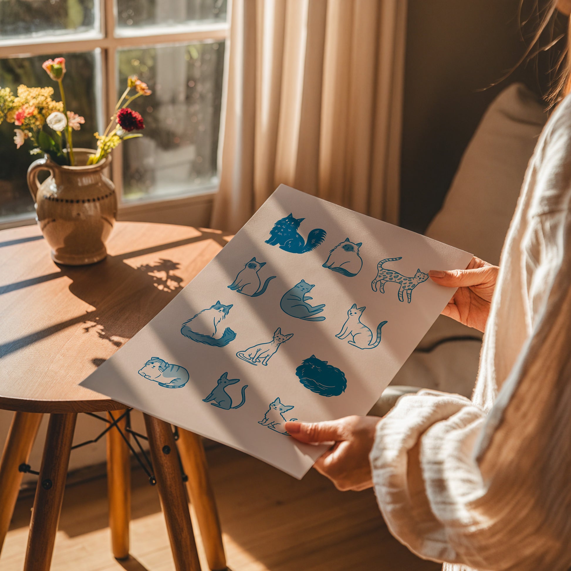 Whether you’re a proud pet parent or shopping for a thoughtful gift, this cat art print is ideal for birthdays, Christmas, housewarmings or just because. Available in three warm-toned colourways to suit any decor style: earthy neutral, bold blue, or classic monochrome.