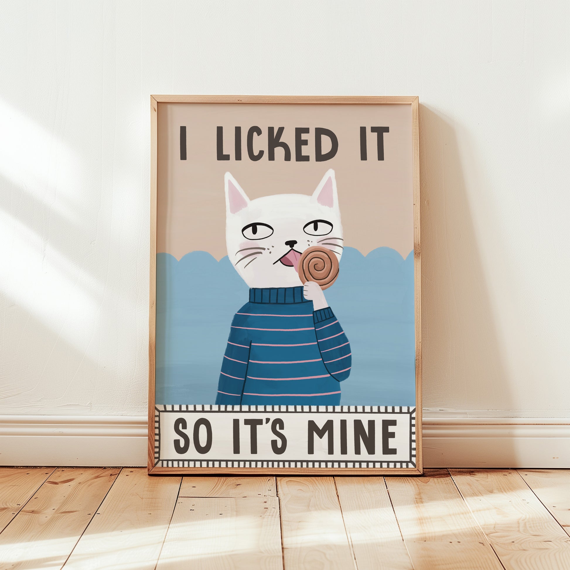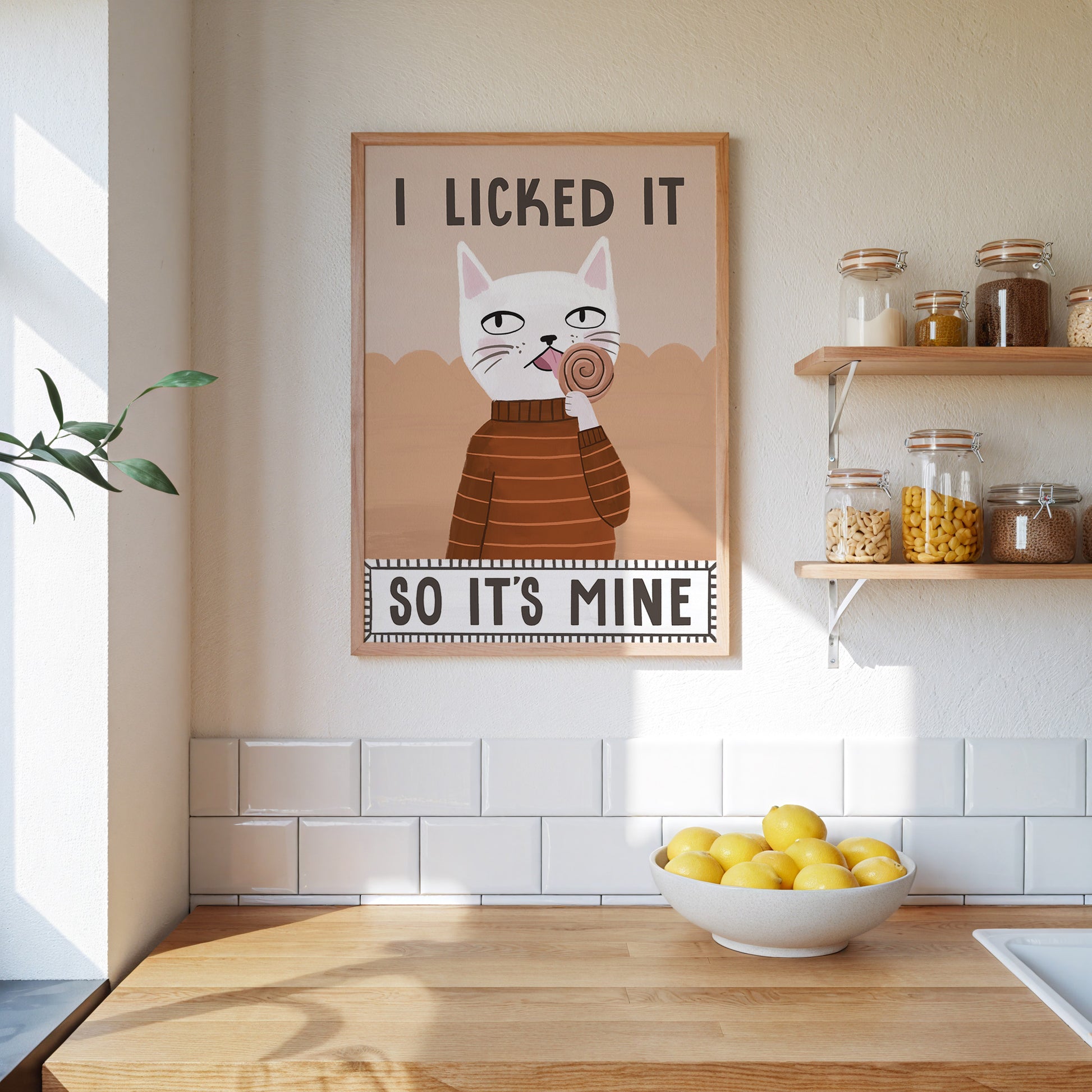 This cheeky cat print is the purr-fect way to add some humour and sass to your home decor! Featuring a white cat in a cosy striped jumper licking a cinnamon roll (and clearly claiming it), this funny wall art is a must-have for food lovers, cat parents, and anyone who takes their snacks very seriously.