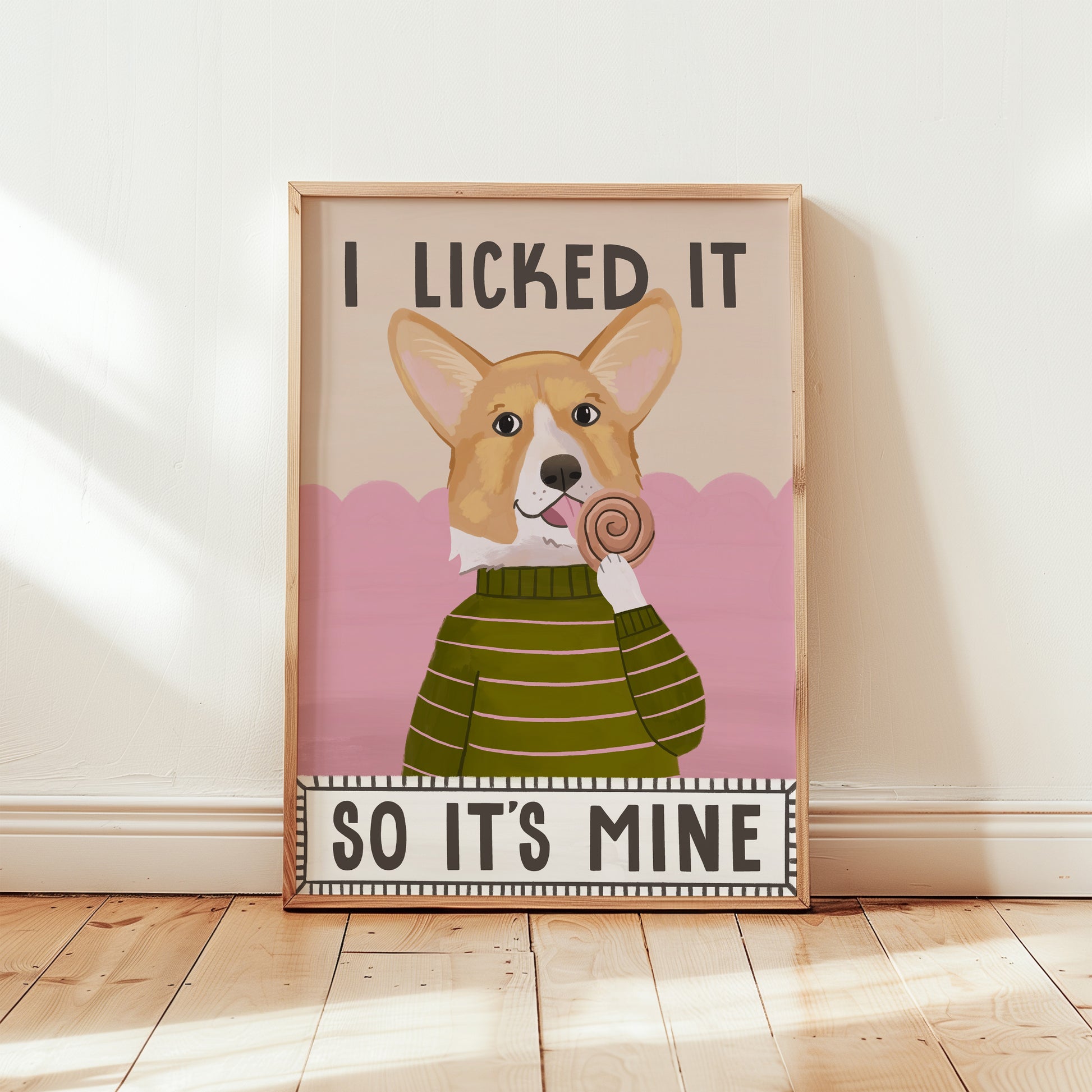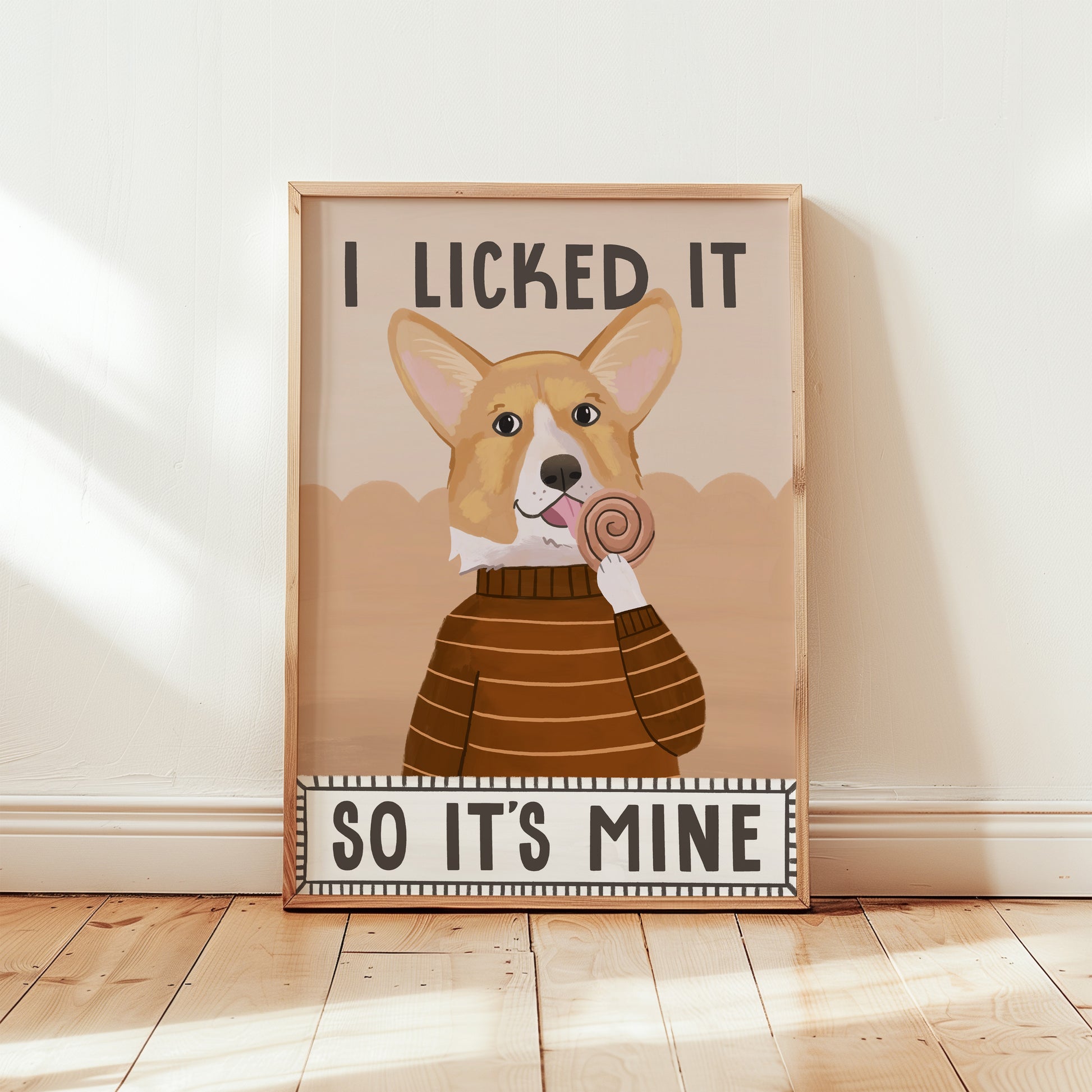 This cheeky dog print is the perfect way to add some humour and sass to your home decor! Featuring a corgi dog in a cosy striped jumper licking a cinnamon roll (and clearly claiming it), this funny wall art is a must-have for food lovers, dog parents, and anyone who takes their snacks very seriously.