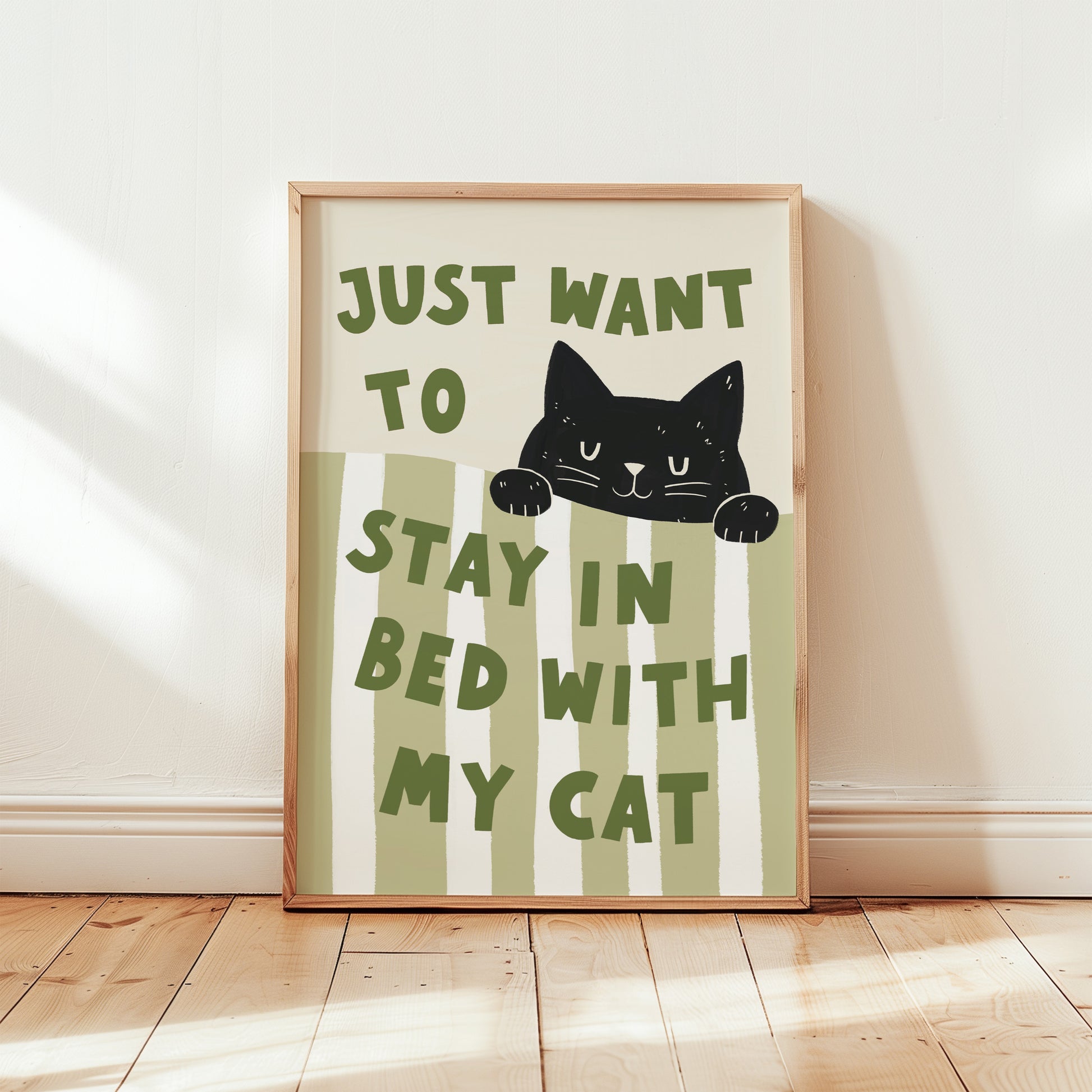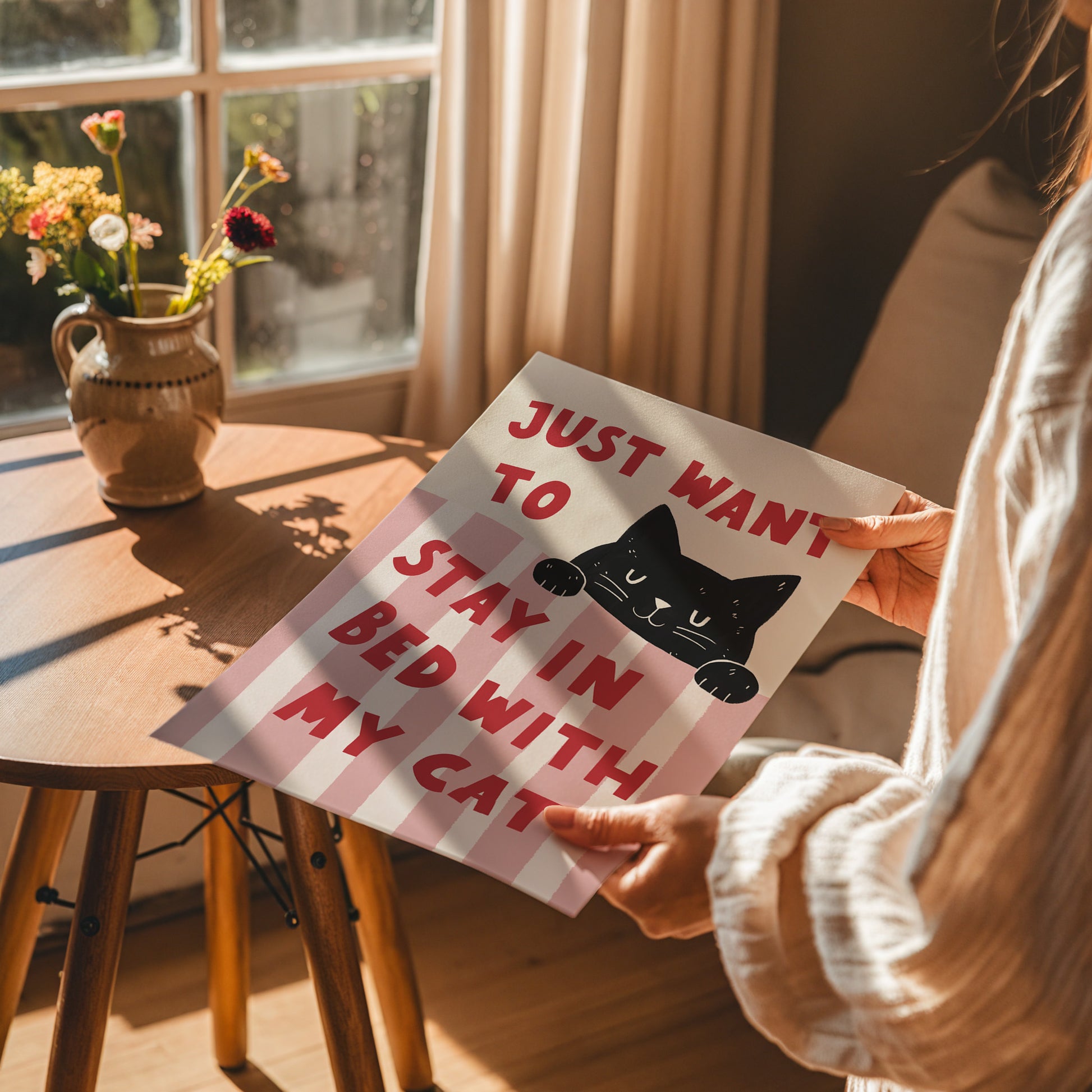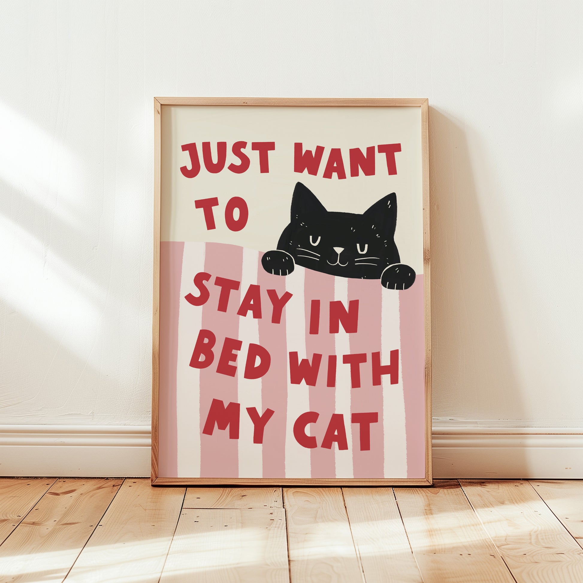 Bring cozy vibes into your space with this delightful illustrated art print featuring the quote “Just want to stay in bed with my cat.” A cheeky black cat peeks from beneath stripey bedding, perfectly capturing the mood of lazy mornings and cat snuggles.