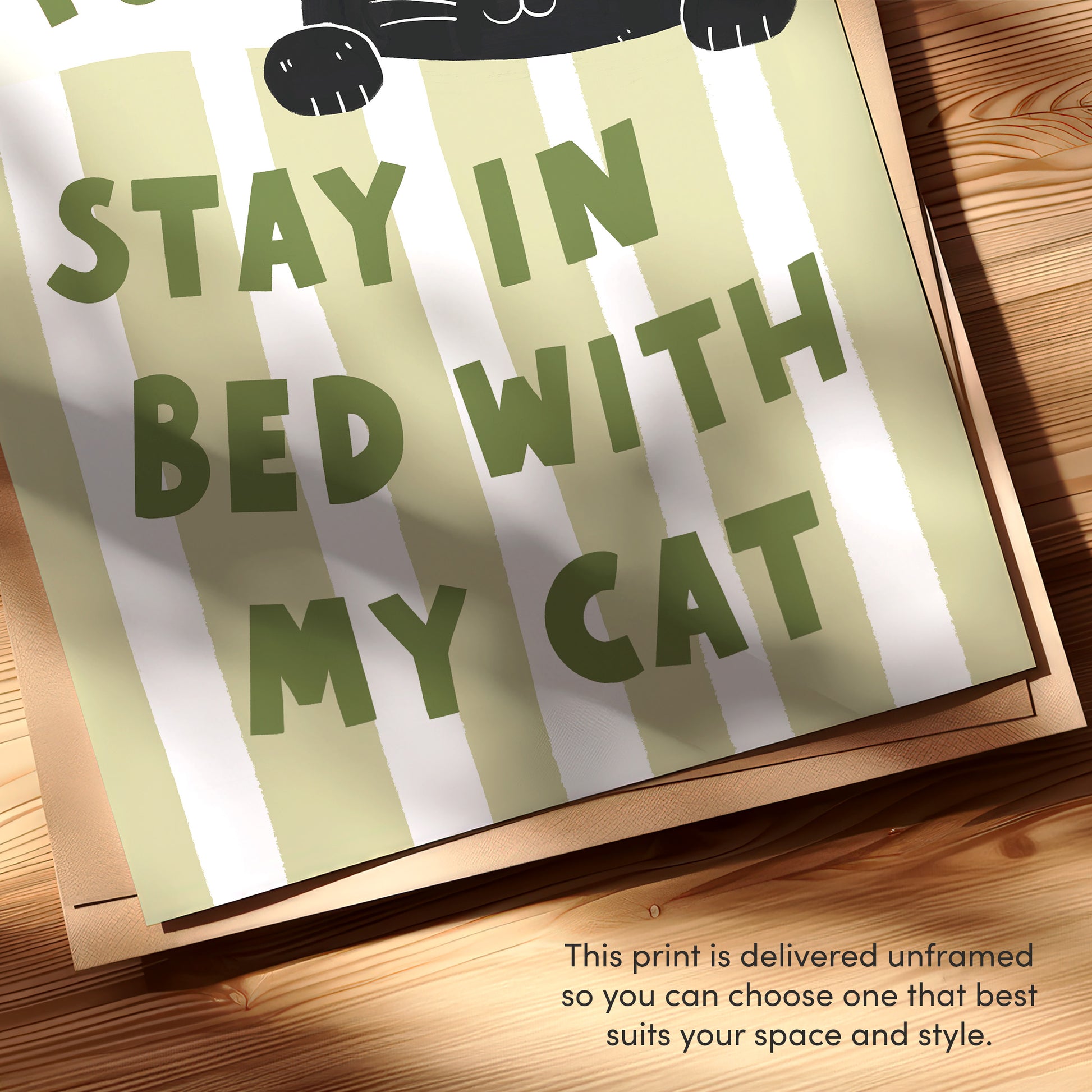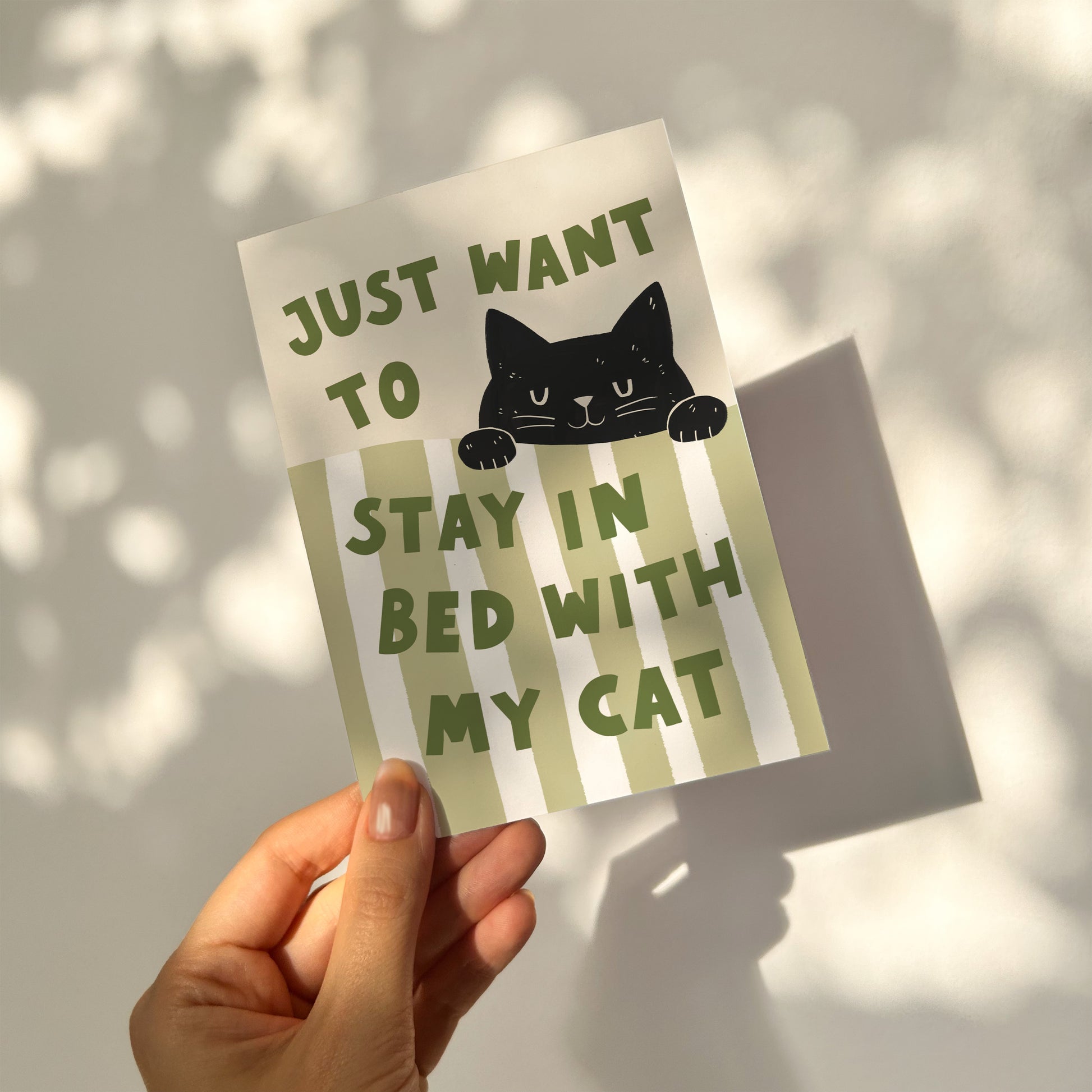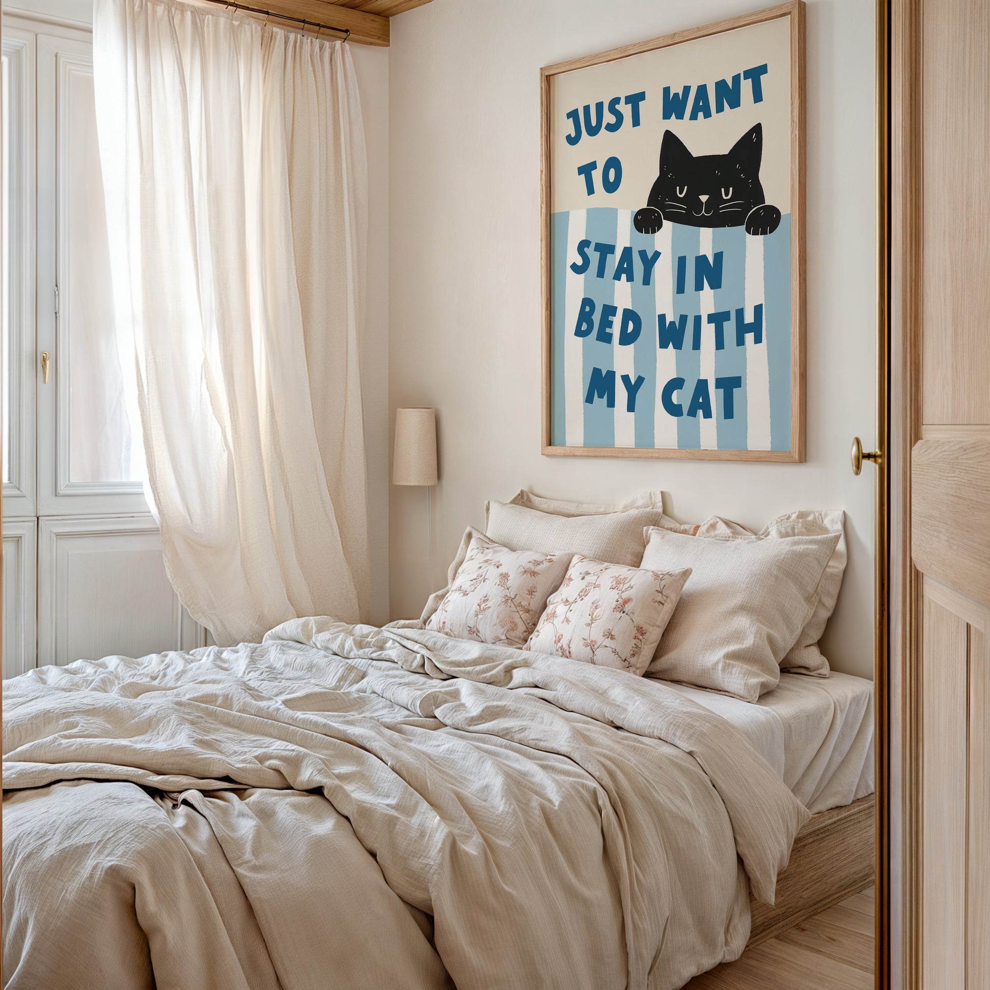 Bring cozy vibes into your space with this delightful illustrated art print featuring the quote “Just want to stay in bed with my cat.” A cheeky black cat peeks from beneath stripey bedding, perfectly capturing the mood of lazy mornings and cat snuggles.