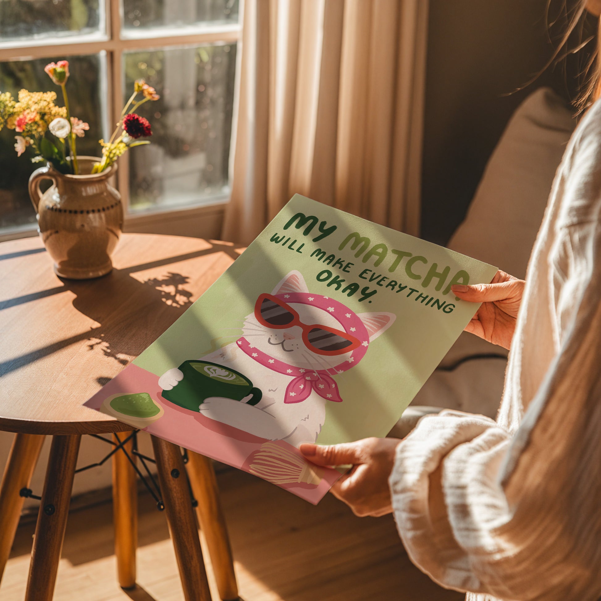Meet your new feel-good print! Featuring a sassy, sunglasses-wearing cat sipping a cozy cup of matcha, this playful artwork is perfect for anyone who believes in the power of a warm drink on a bad day. With the caption “My Matcha Will Make Everything Okay”, this cat print is ideal for matcha lovers, tea drinkers, and cat lovers alike.