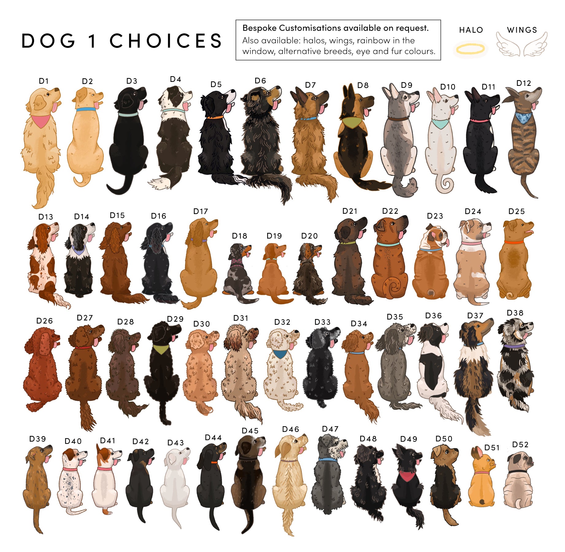 Use the codes next to each illustration in the template images to choose your dogs. If there are any particular cat or dog colours or markings you don’t see as an option, send us a picture (preferably of their back) and we will make it for you.