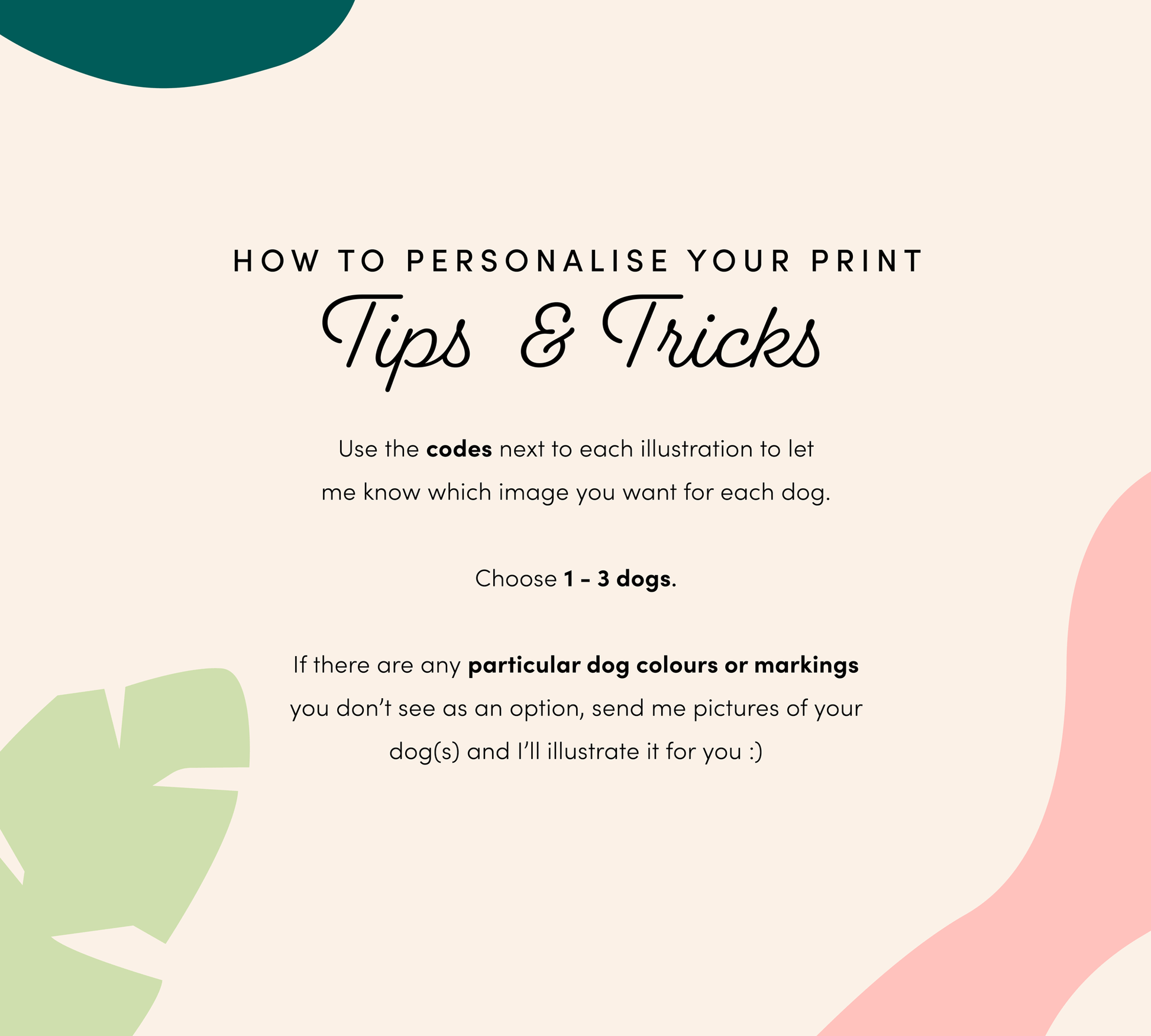 Please note: If you would like a more customised cat drawn, please remember to specify which way you would like the dog facing. If you decide to change the direction after the first preview is sent, there is an additional charge of £5 per dog. Feel free to upload photos to your order here, or email them to me at prints.designedbyleanne@gmail.com