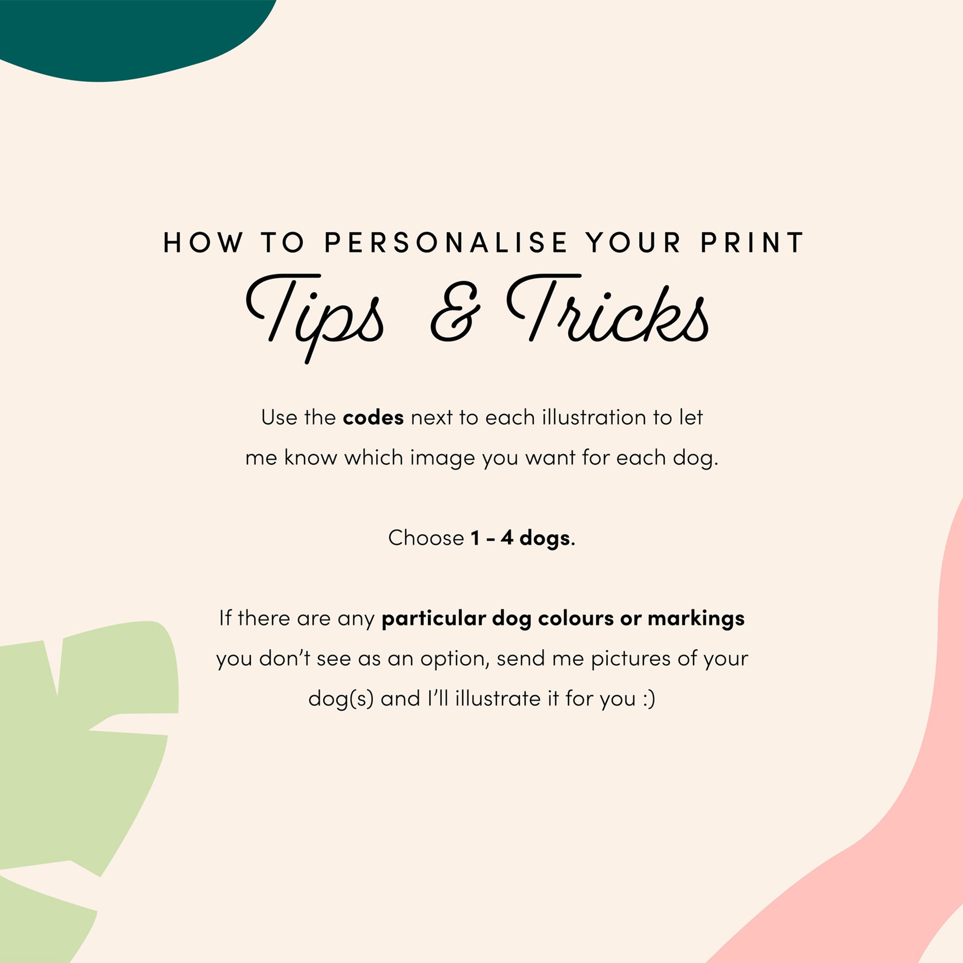 Please note: If you would like a more customised dog drawn, please remember to specify which way you would like the dog facing. If you decide to change the direction after the first preview is sent, there is an additional charge of £5 per dog. Feel free to upload photos to your order here, or email them to me at prints.designedbyleanne@gmail.com