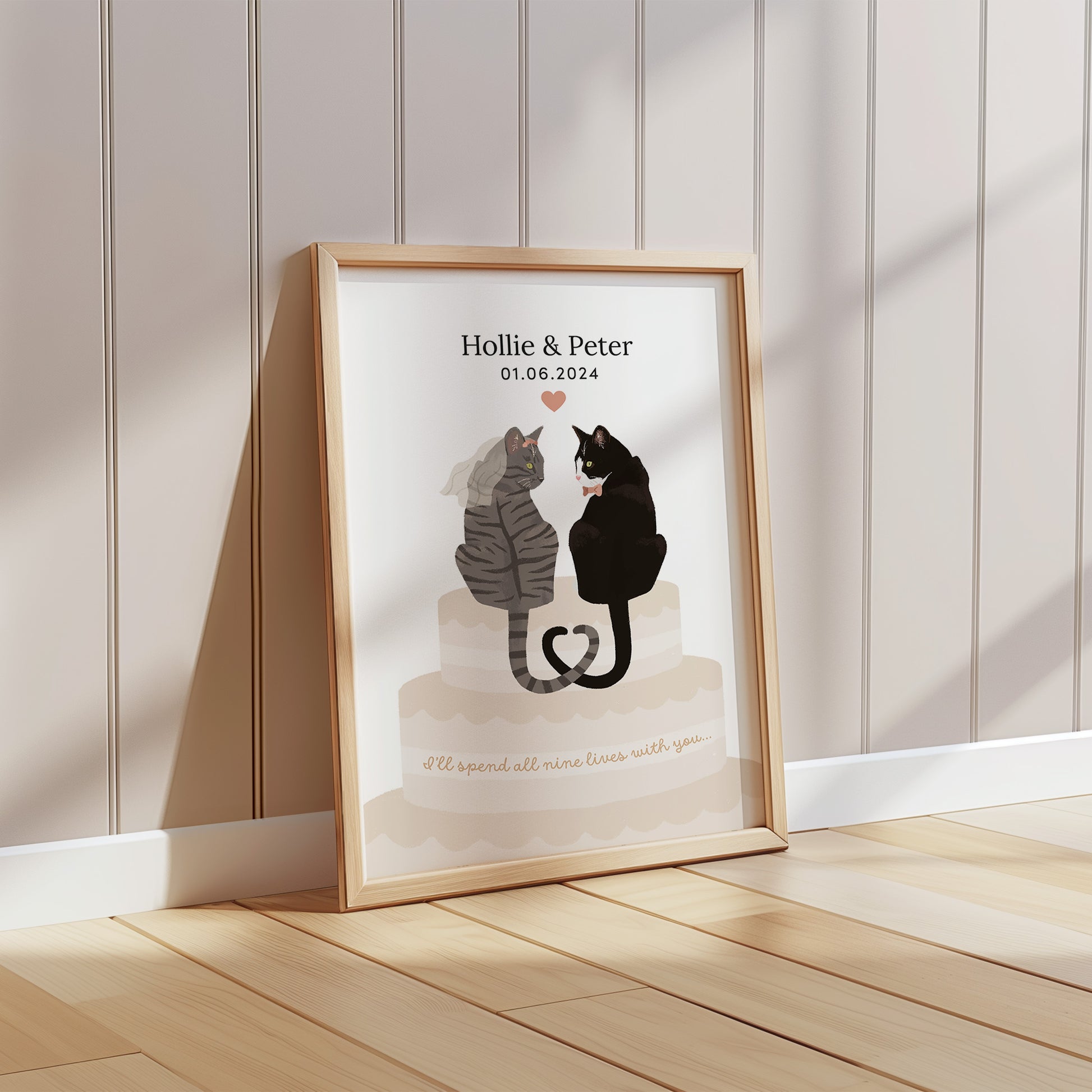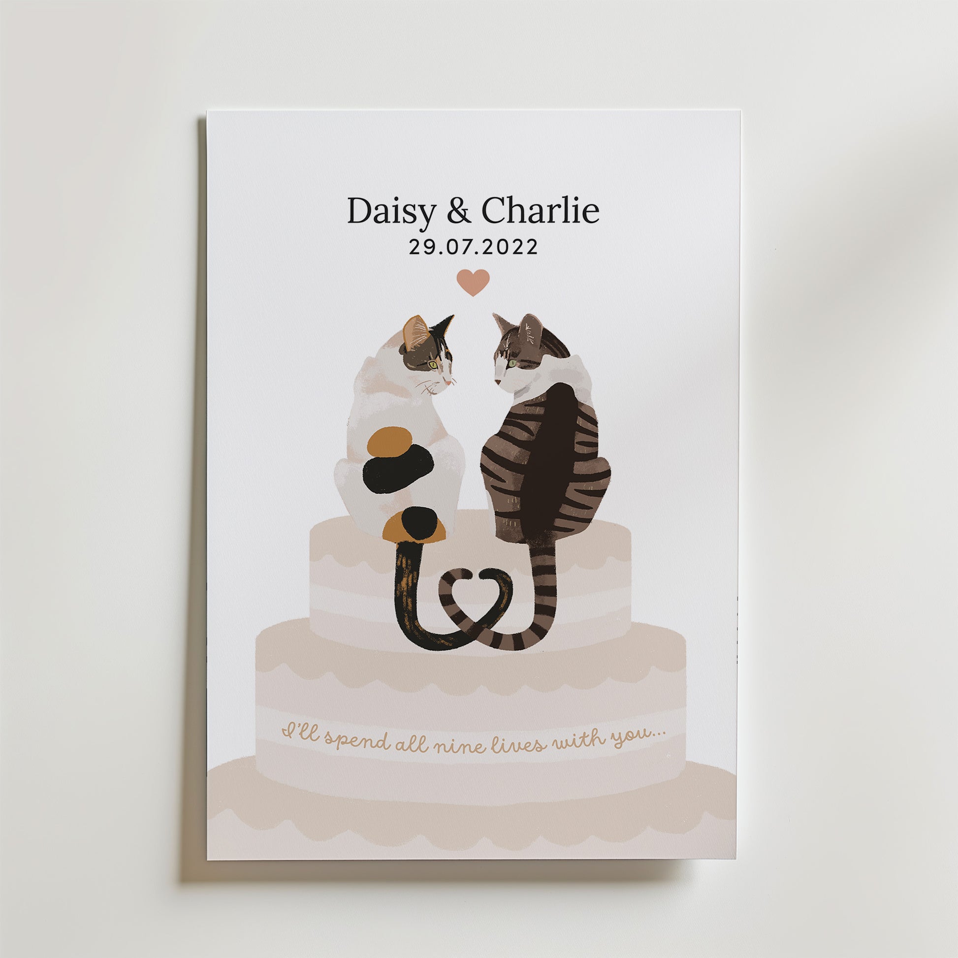 The perfect wedding or anniversary gift for a couple obsessed with their 2 cats. Customise the modern, simple print to represent a couple's special day with their special pets.