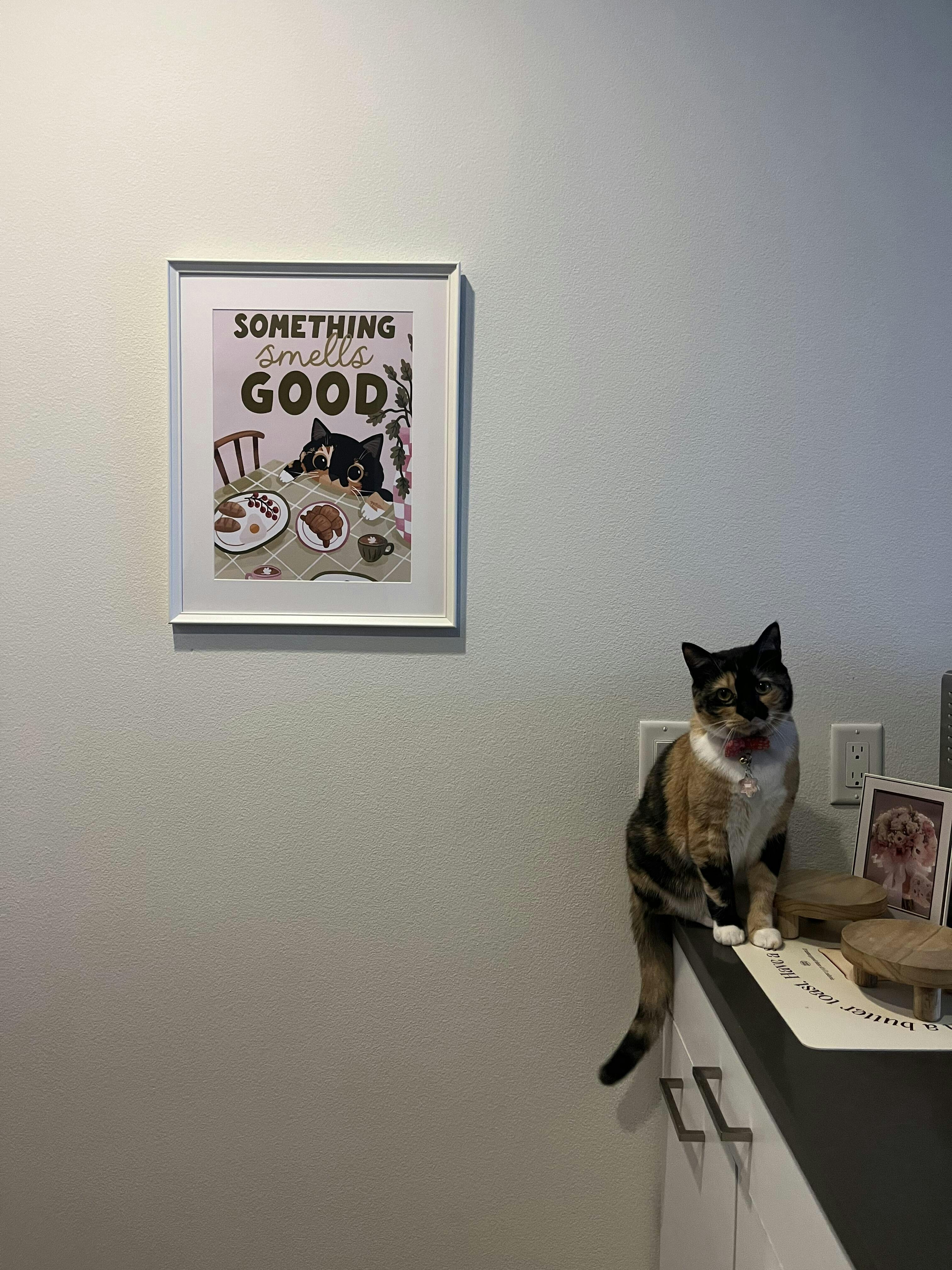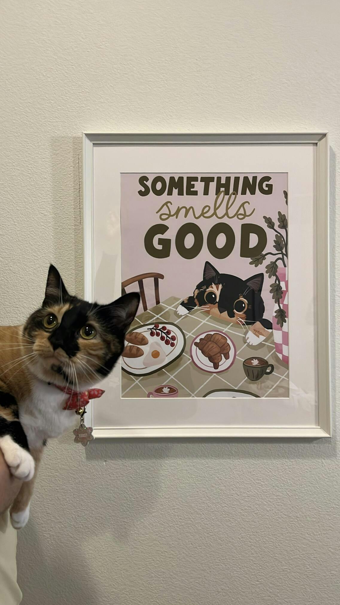 Adorable art print featuring a curious black-and-white cat peeking over a breakfast table like they’ve just caught a whiff of something delicious! From buttery croissants to steamy matcha lattes, this foodie-inspired cat artwork brings the purr-fect touch of humour to your home.